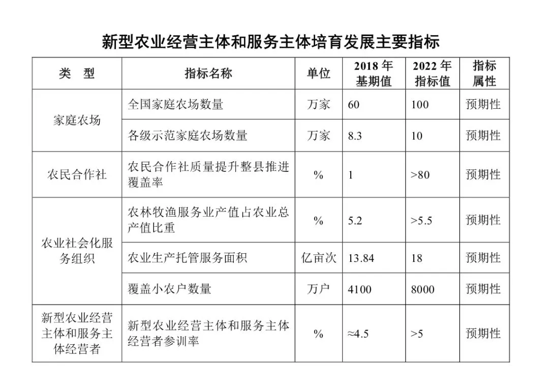 到2022年,家庭农场、农民合作社、农业社会化服务组织等各类新型农业经营主体和服务主体蓬勃发展,现代农业经营体系初步构建,各类主体质量、效益进一步提升,竞争能力进一步增强。具体实现以下目标。
