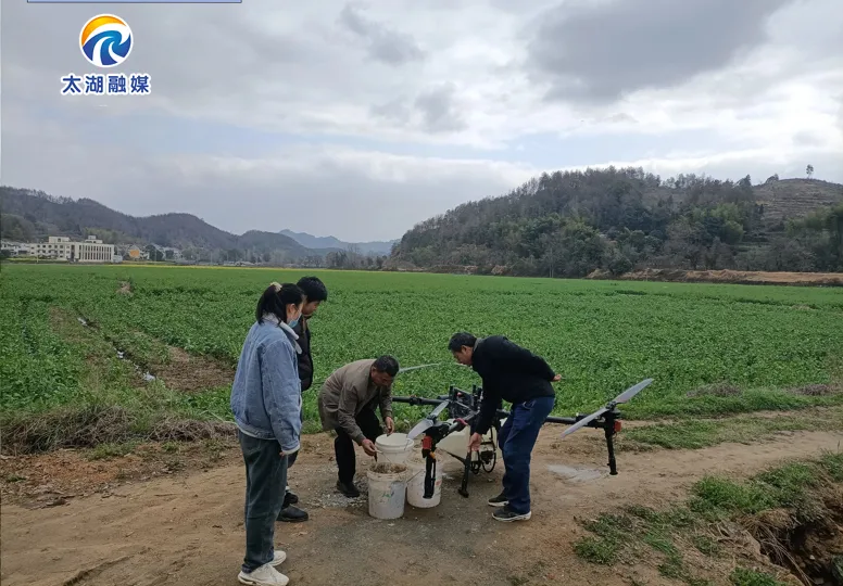 在河口村方田圩,太湖县乐农农业发展农民专业合作社正开展油菜飞防作业,农技人员全程驻点指导,细致讲解药剂混配与二次稀释技术:“不同药剂需分别进行二次稀释,充分混匀后再加入盛有清水的药桶,随后加满清水搅拌均匀。这样既能有效防止喷头堵塞,减少药剂间不良反应,也可避免因浓度不均引发药害,最大程度保障施药效果。”