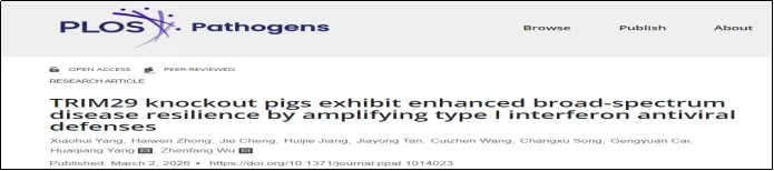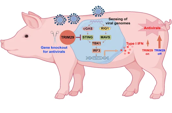 传统育种技术在提升猪生长速度、瘦肉率等重要经济性状方面成效显著,但由于抗病性状难以度量、易受非遗传因素干扰,其遗传改良一直是育种面临的重大挑战。基因编辑技术是实现抗病育种的有效手段,本研究围绕猪干扰素负调节因子TRIM29基因,旨在增强猪的I型干扰素天然免疫应答,建立了一种新的广谱抗病基因编辑育种策略。主要研究结果如下: