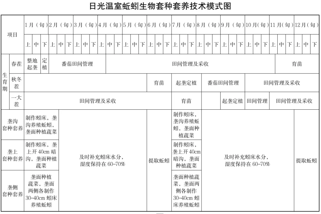技术要点:分为套种套养和尾菜处理两种模式。套种套养模式:在日光温室、拱棚采用大行距栽培,垄面种植作物,垄沟、垄侧或垄上养殖蚯蚓,亩用牛粪等畜禽粪便、秸秆或蔬菜尾菜40m3,蚯蚓种30-50kg,将秸秆、蔬菜尾菜粉碎至5cm以下,与畜禽粪便按1:2混合,加入生物腐熟剂,大水浇透,闷堆发酵腐熟15-20天,按垄距240cm起垄,垄面宽80cm,垄高20-30cm。定植前7-10天制作蚓床,1-2天后投放蚯蚓种,蚓床湿度保持在60-70%,适宜温度15-25℃。尾菜处理模式:物料准备同上,按1.5m间距制作蚓床,蚓床宽1.0-1.2m,高30cm,蚓床上开两条浅沟投放蚯蚓,投放结束后在蚓床上铺放蔬菜尾菜或稻草,厚度3-5cm,铺设1条微喷带,蚓床湿度保持在60%-70%,温度保持在15-25℃,35-40天可提取蚯蚓一次,提取时用在蚓床上面添加腐熟牛粪,厚5-10cm,引诱蚯蚓取食,待蚯蚓密度大时将蚓床上层物料移到垄侧地布上,用耙子将表层蚯蚓粪抓松,晾晒5-10分钟,用刮板刮去表层晾干的蚯蚓粪,再用耙子将表层抓松,晾晒后再刮去表层蚯蚓粪,经过5-8次,待蚯蚓全部集中到蚓床底层时即可提取。