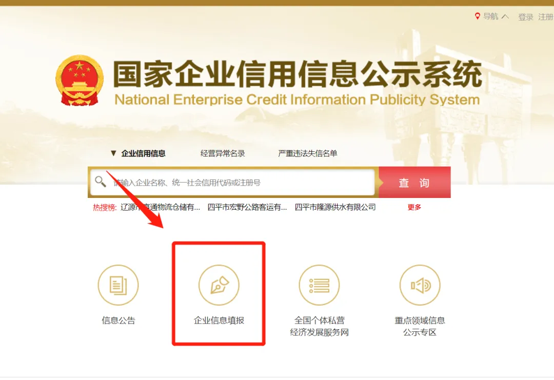 进入“国家企业信用信息公示系统”后,点击“企业信息填报”,选择“登记机关所在地”,进入企业年报