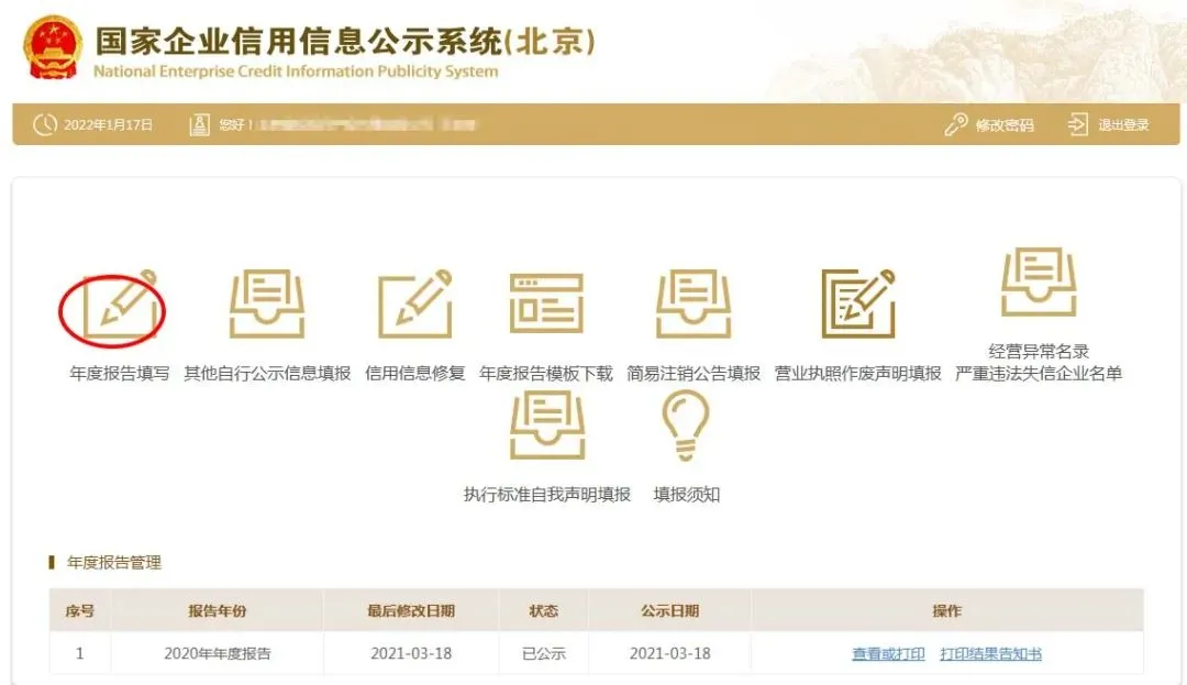 二、点击左上角“年度报告填写”。