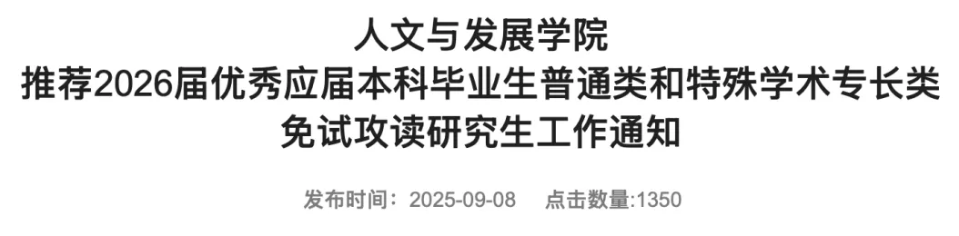 2025年9月,中国农业大学人文与发展学院发布了《推荐2026届优秀应届本科毕业生普通类和特殊学术专长类免试攻读研究生工作通知》。