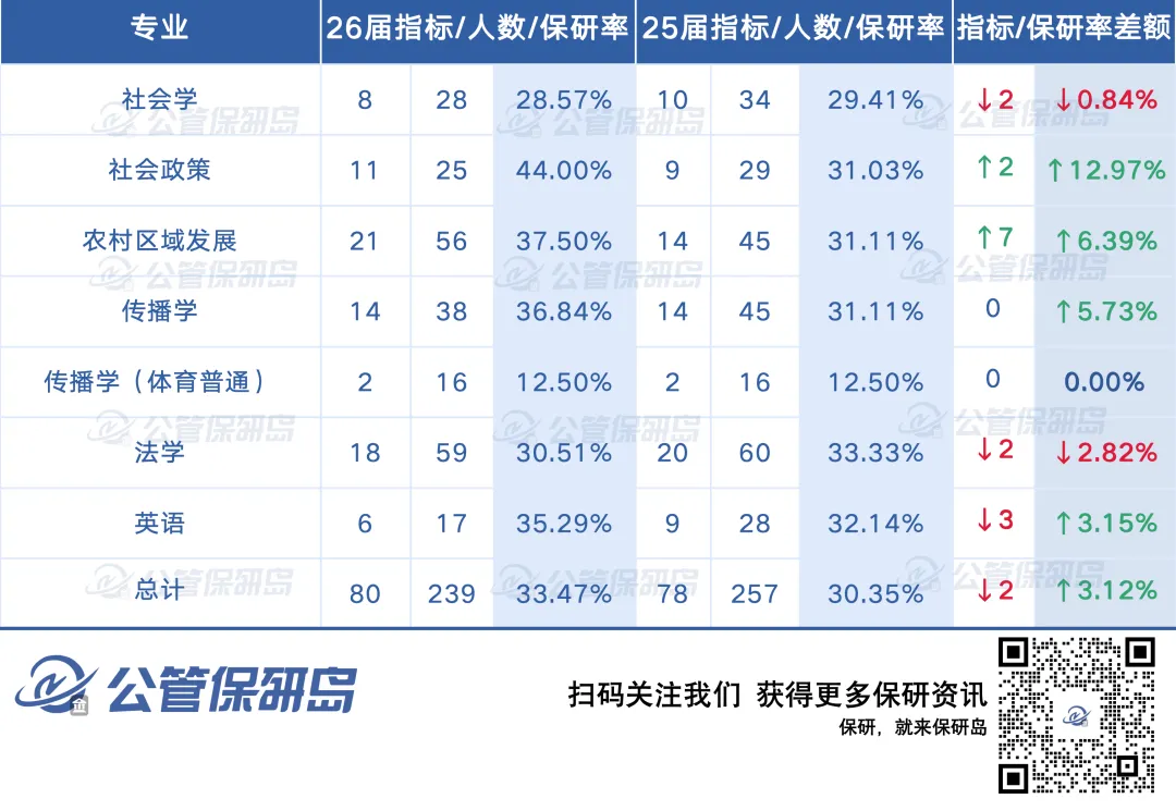 中国农业大学人文与发展学院2026届公管相关专业中。社会学保研名额减少2人,社会政策及农村与区发展保研名额分别增加2人、7人,其中社会政策保研率大涨13%。