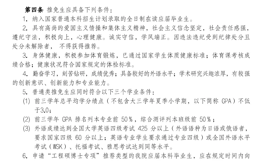 前三学年总平均学分绩点(不包含大三学年夏季小学期)不低于3.0;前三学年GPA 排名列本专业前50%,综合测评列本班级前50%。