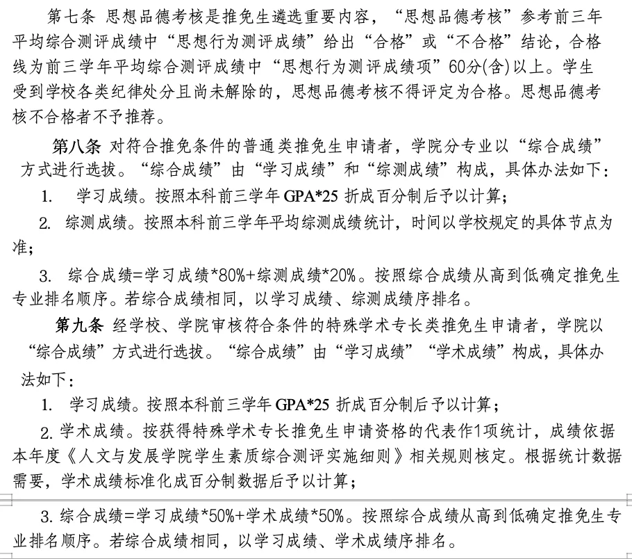对符合推免条件的普通类推免生申请者,学院分专业以“综合成绩” 方式进行选拔。“综合成绩”由“学习成绩”和“综测成绩”构成,具体办法如下: