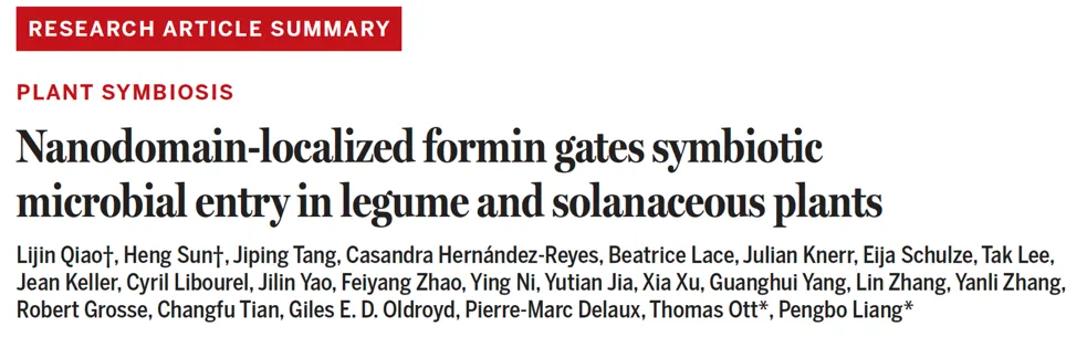 北京时间2026年3月6日,中国农业大学生物学院梁鹏博团队在《科学》(Science发表了题为“Nanodomain-localized formin gates symbiotic microbial entry in legume and solanaceous plants”的研究论文。