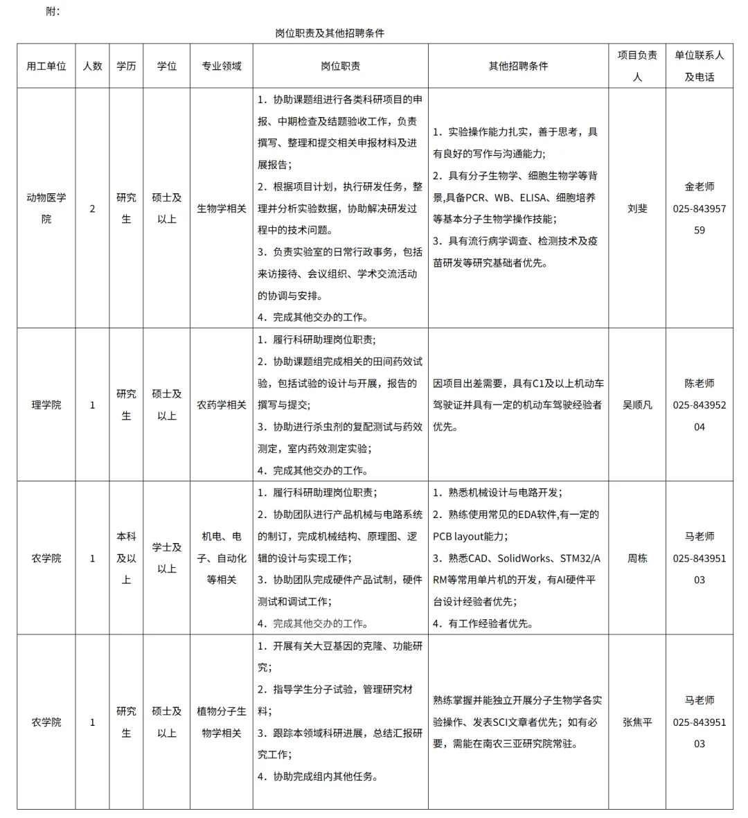 声明:本微信公众号刊载此文,无任何商业目的,目的是架起求职者和用人单位之间的桥梁,传递更多的招聘就业信息。若来源标注错误或侵犯了您的合法权益,请及时与我们联系,我们将及时更正、删除或依法处理,微信号(含:商务合作):xiongcairenli 点击下方,关注江苏医护/医院招聘,祝您顺心,敬转好友南京农业大学坐落于钟灵毓秀、虎踞龙蟠的古都南京,是一所以农业和生命科学为优势和特色,农、理、经、管、工、文、法学多学科协调发展的教育部直属全国重点大学,是国家“211工程”重点建设大学、“985优势学科创新平台”和“双一流”建设高校。经研究,现公开招聘科研助理5名。
