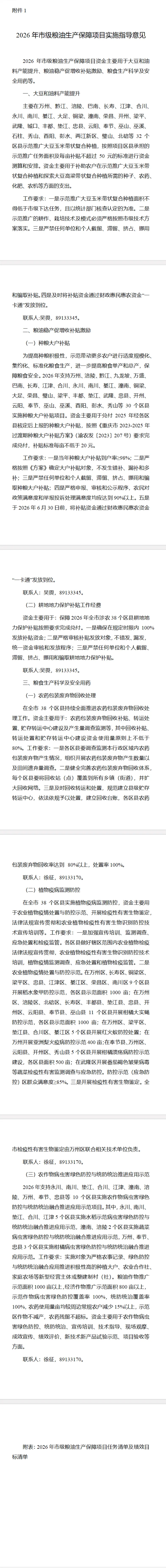 为深入贯彻党的二十大和二十届历次全会精神,认真落实习近平总书记关于“三农”工作的重要论述,扎实落实中央一号文件精神,深入落实市委六届历次全会、市委经济工作会议和市委农村工作会议精神,坚持农业农村优先发展,锚定农业农村现代化,深入学习运用“千万工程”经验,迭代实施“四千行动”,2026年市级财政安排了粮油生产保障、耕地建设与利用、农业产业发展、农业生态资源保护及防灾减灾、农业服务体系建设等专项资金(资金文件详见渝财农〔2025〕124号)。为指导各区县(自治县,以下简称区县)做好项目实施工作,加强资金使用管理,提高资金使用效益,现将有关事项通知如下。