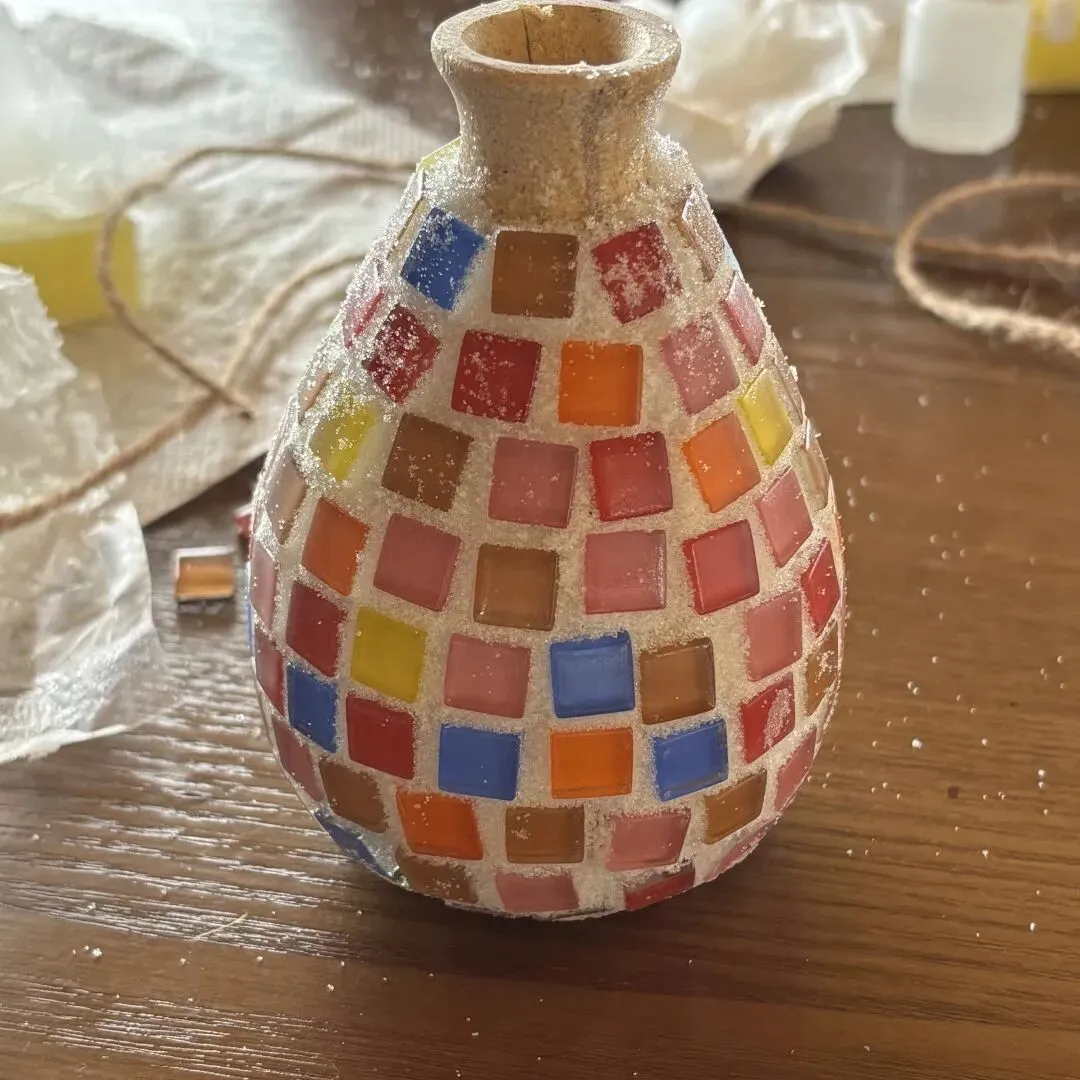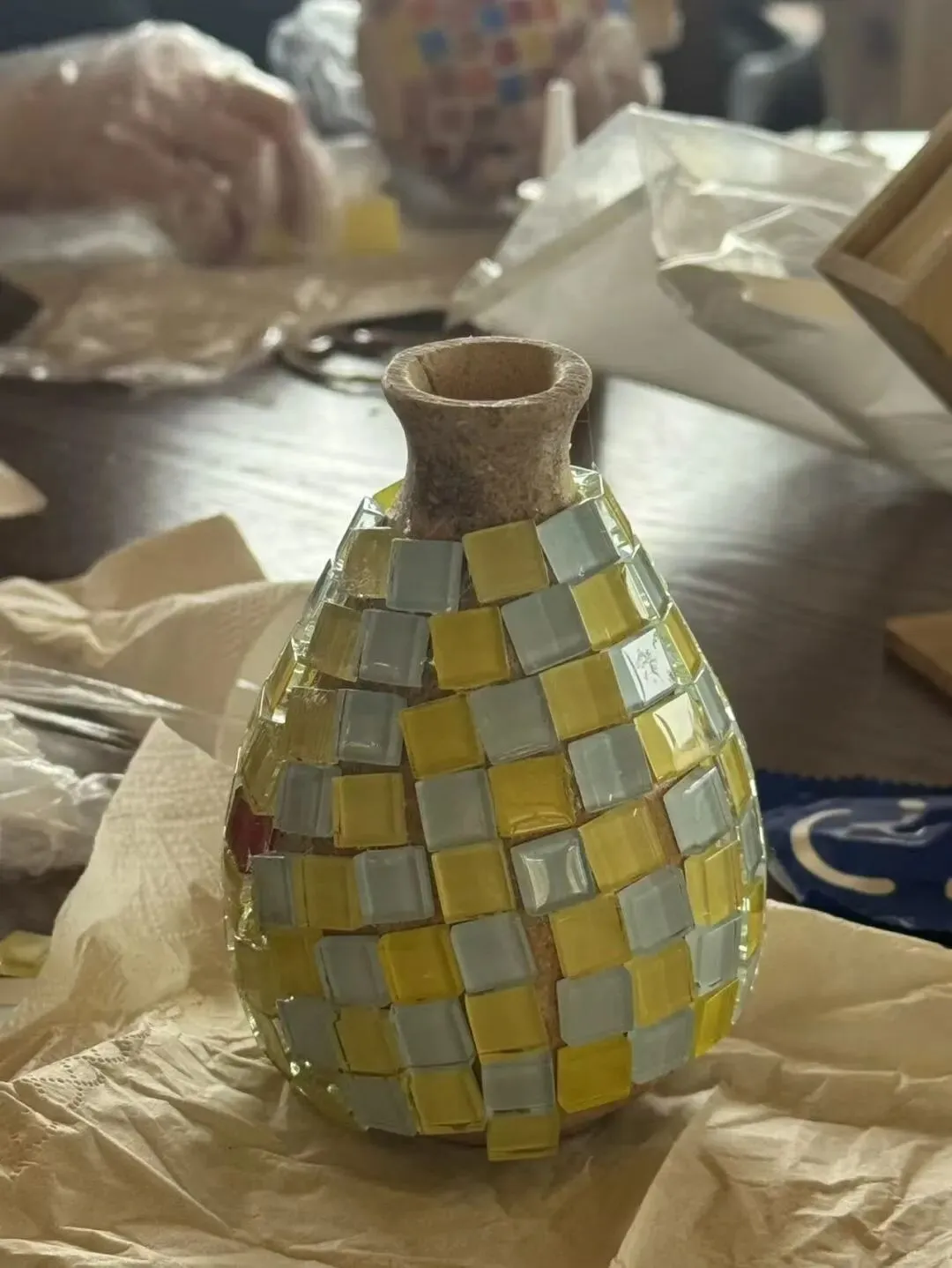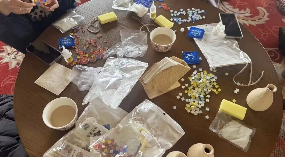 活动现场,马赛克花瓶制作正忙。大家发挥想象,将碎片拼成独特图案,用双手装点生活,让平凡花瓶绽放个性光彩。