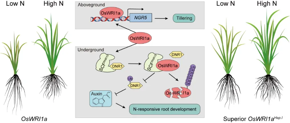 研究团队筛选到一个根-冠生物量比对氮响应不敏感的突变体,从中鉴定到了协调水稻根系与地上部响应外界氮供应、维持根-冠比稳态、促进水稻生长发育的关键因子OsWRI1a(WRINKLED1a)。该基因在低氮条件下无需改变常规的碳分配模式即可促进水稻根系的生长。此前李姗团队的研究指出,F-box蛋白RNR10可通过单泛素化修饰生长素合成抑制因子DNR1,抑制其降解,从而负调控根系氮响应。该研究进一步发现,OsWRI1a也能与RNR10互作,其K139、K156和K225位点被RNR10介导多泛素化修饰,进而被降解。OsWRI1a在根系中具有双重调控功能:一方面,它通过与DNR1竞争性结合RNR10,破坏DNR1稳定性,从而提升生长素水平,促进生长素介导的根系发育;另一方面,OsWRI1a可作为转录因子直接激活氮代谢相关基因表达,促进氮代谢过程。另外,研究还显示不同E2泛素结合酶组分及底物-SKP复合物空间构象变化可实现RNR10在单泛素化修饰DNR1与多泛素化修饰OsWRI1a之间的切换。在地上部,OsWRI1a通过激活NGR5表达促进分蘖发生。值得注意的是,OsWRI1a在分蘖芽中与RNR10呈现微弱互作,既避免OsWRI1a自身被RNR10介导的多泛素化降解,又不干扰RNR10与DNR1之间的相互作用。这一现象揭示了OsWRI1a调控机制具有明显的组织特异性。最终,将优异等位基因导入粳稻品种“武运粳7号”,可在低氮条件下稳定根冠比,显著提高氮肥利用效率与产量,展现了突出的育种应用潜力。