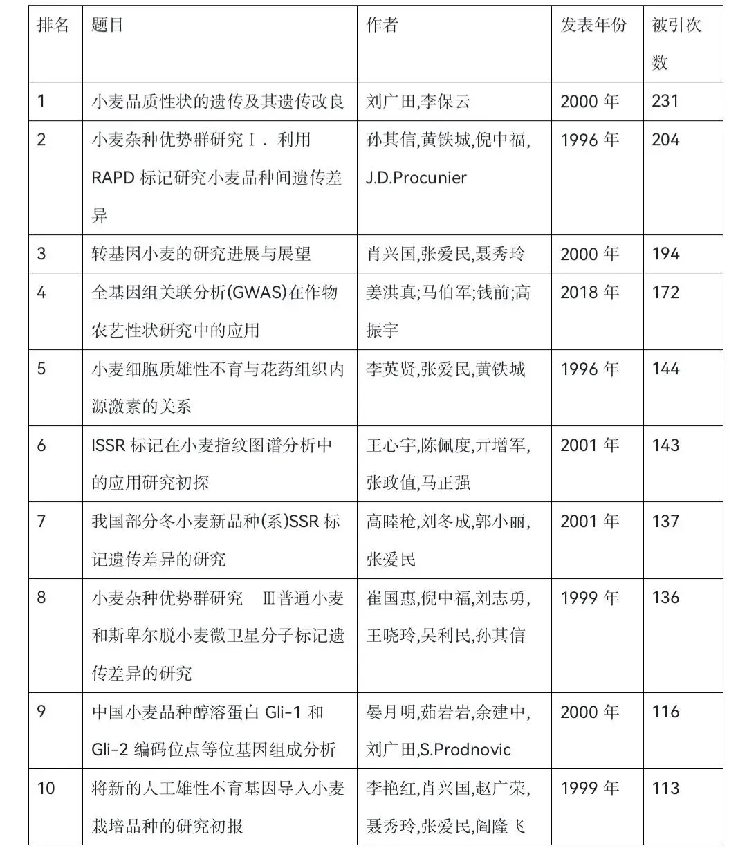 《农业生物技术学报》创刊以来,排名前十的小麦相关高被引论文(被引> 100次)集中在1996-2000年,该时期分子标记技术逐渐成为主流工具,研究多以遗传多样性、杂种优势、标记应用领域为主,基因克隆和功能验证研究较少,且研究紧密围绕小麦育种实际需求(杂种优势、杂交制种、品质、遗传背景分析),这些文章代表了我国小麦生物技术发展初期研究的最高水平。这些高被引论文呈现原创性强、育种应用价值高、技术方法先进三大共同特征,对推动小麦生物技术发展具有里程碑意义。