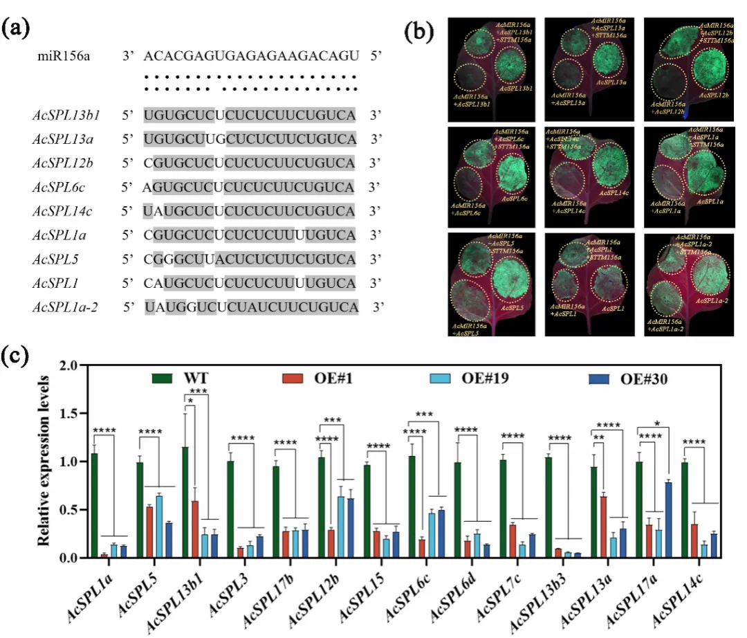 研究发现,miR156a在感病猕猴桃品种中的表达量显著高于抗病品种,其表达水平与品种抗性呈负相关,提示其可作为抗病育种的重要候选靶标。通过过表达和短串联靶标模拟(STTM)抑制技术,研究证实miR156a通过靶向14个SPL转录因子,负向调控猕猴桃对丁香假单胞杆菌猕猴桃致病变种(Psa)引起的溃疡病的抗性。进一步的机制解析表明,AcSPL6c和AcSPL14c是该调控通路中关键的免疫正调控因子。miR156a-SPL模块通过调控水杨酸(SA)和茉莉酸(JA)的激素信号重编程,精细调控宿主免疫应答,从而实现对溃疡病的抗性调节。