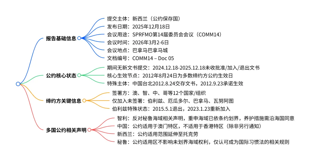 本报告是新西兰作为《南太平洋公海渔业资源养护和管理公约》保存国,为2026年3月2-6日巴拿马城召开的SPRFMO第14届委员会会议提交的公约现状文件(COMM14 – Doc 05),发布于2025年12月18日。
