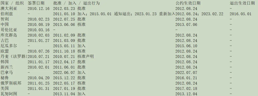 附件列明 17 个国家 / 组织的公约签署、批准 / 加入、生效信息,伯利兹是唯一有退出后重新加入记录的主体,2012.8.24 为多数缔约方生效日;