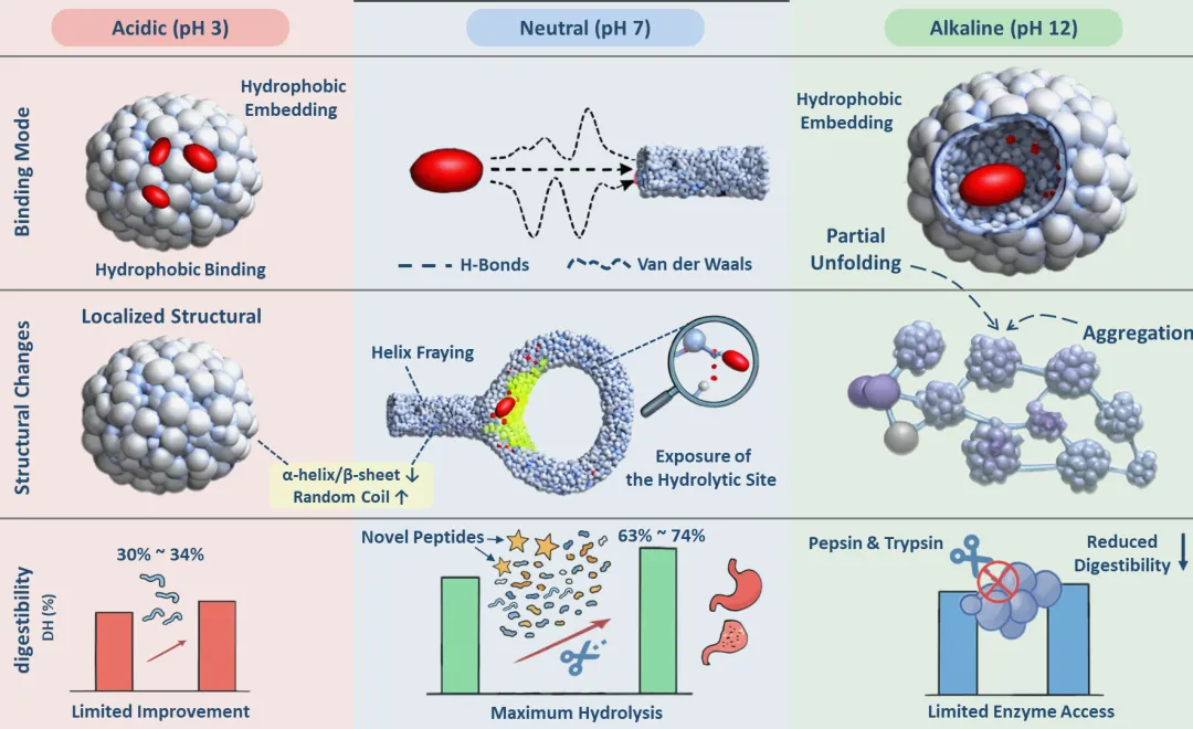 研究发现,番茄红素与肌原纤维蛋白的结合方式具有显著的pH依赖性:在中性条件下,其相互作用主要由氢键和范德华力驱动,而在酸性与碱性环境中则以疏水作用为主。番茄红素的嵌入可诱导肌原纤维蛋白结构性重构但不破坏表面特性,有助于抑制蛋白过度聚集,提高体系的胶体稳定性。番茄红素可显著增强肌原纤维蛋白在中性pH条件下的水解程度和肽段释放水平,其优先结合于富含胰蛋白酶切位点的关键结构区域,通过破坏局部氢键网络,增加酶切位点的可及性,从而促进蛋白水解。该研究从分子互作与结构功能视角,阐明了番茄红素如何通过精细调控蛋白质结构来提升其营养效价,为开发高消化吸收率的营养强化肉制品,提供了理论依据与技术路径。