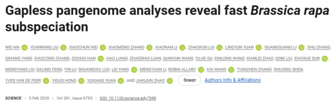 2026年2月“Science”杂志在线发表了河北农业大学赵建军教授联合多家单位“Gapless pangenome analyses reveal fast Brassica rapa subspeciation”的研究论文,该研究在白菜图泛基因组的基础上,系统解析了着丝粒重塑和大规模结构变异对其亚种快速分化的作用。研究成果为理解被子植物快速进化与作物驯化提供了重要的理论依据,为甘蓝类作物性状改良方面提供重要的基因资源。该研究以快速多样化分化的白菜为模型,通过构建包含1720份材料重测序和11个T2T无间隙基因组的高质量泛基因组,系统解析了开花植物快速演化的基因组基础。研究揭示了着丝粒动态变化和结构变异在物种形成和形态型分化中的关键作用,绘制了高分辨率着丝粒和结构变异图谱,并验证了调控白菜叶球发育的关键基因BrLH1。该泛基因组资源为理解植物快速多样化机制提供了新见解。