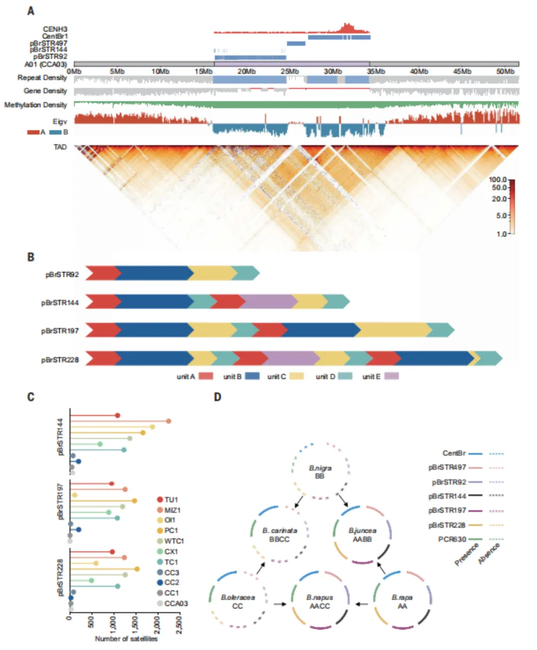 通过对芸薹属(Br)多个亚种和形态型基因组中着丝粒及着丝粒周边区域的序列组成、结构特征与进化动态。通过染色质免疫沉淀测序(ChIP-seq)技术,利用着丝粒特异性抗体精准定位了11个材料共110条染色体的着丝粒区域,发现其大小在0.58至2.20 Mb之间,平均为1.16 Mb。这些着丝粒主要由CentBr1和CentBr2卫星重复序列组成,并伴有特定类型的LTR逆转录转座子(如Ale/Copia和CRM/Gypsy),基因数量稀少且表达水平普遍较低。还鉴定了五种新型卫星重复序列(如pBrSTR92、pBrSTR144等),并揭示了其通过基本单元复制形成的演化关系。通过比较不同Br形态型和亚种,发现这些卫星序列存在显著的拷贝数变异,表明快速演化的卫星序列扩张与收缩可能驱动了着丝粒的进化,并与物种分化相关联。进一步对六种芸薹属物种的比较分析显示,这些卫星序列主要存在于AA基因组中,可能起源于CC基因组,并在异源多倍体中得以保留。最后,研究发现不同染色体的着丝粒进化速率差异巨大,其中10号染色体(A10)的着丝粒结构在多个材料中高度保守,且该区域内包含多个对植物生长发育至关重要的功能基因,暗示其结构保守性可能受到关键基因功能的限制。