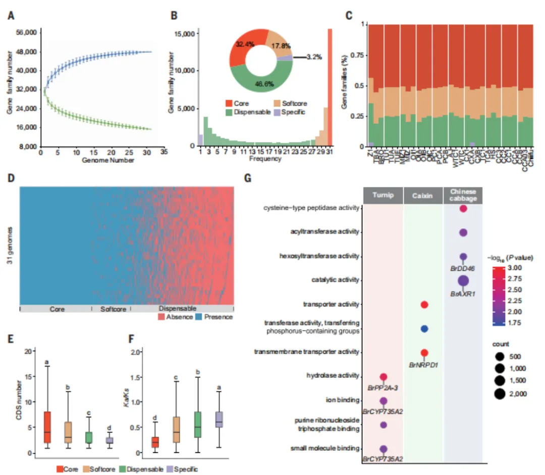 该研究构建了一个基于蛋白编码基因的甘蓝型油菜泛基因组,整合了11个新组装的T2T基因组和20个已发表的基因组。通过分析31个油菜品系的1,439,526个基因,将其聚类为47,946个非冗余泛基因家族。分析显示基因家族数量已达到饱和。根据基因在不同品系中的分布,鉴定出15,558个核心基因家族(存在于所有品系中)和32,388个可变基因家族(至少在一个品系中缺失)。可变基因家族进一步分为8536个软核心基因家族(存在于28-30个品系)、22,340个非必须基因家族(存在于2-27个品系)和1512个特有基因家族(仅存在于一个品系)。研究发现,核心和软核心基因的CDS数量和长度显著大于非必须和特有基因,且非同义替换率与同义替换率比值从核心到特有基因逐渐增加,表明非必须和特有基因进化速率更快,可能与形态类型多样化和亚种分化的农艺性状相关。研究还聚焦于亚种特异性基因,分别鉴定出芜菁(膨大根)、菜心(无需春化)和大白菜(叶球)中特有的基因,这些基因可能分别与根系发育、开花和叶片发育相关,为甘蓝型油菜的形态类型形成和亚种分化提供了基因组基础。