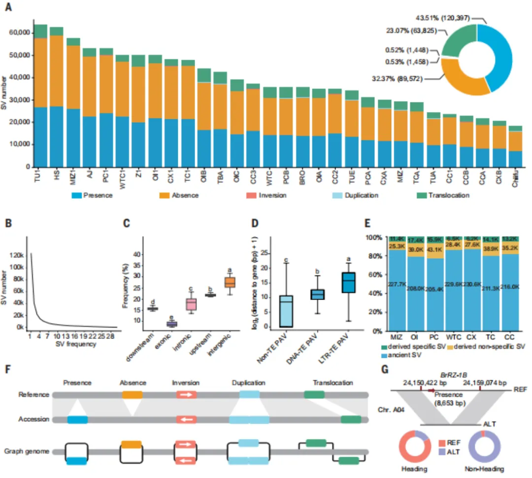 该研究构建30份芸薹属种质的图形泛基因组,共鉴定出276,700个结构变异(SV),包括PAV、倒位、重复和易位。分析表明,大部分SV为稀有变异,主要分布于染色体臂和基因间区,并与转座元件密切相关。群体遗传学分析揭示SV对形态型分化具有重要贡献。通过将SV整合至泛基因组图谱,对1720份材料进行重测序关联分析,发现多个与重要农艺性状相关的PAV,如调控叶球形成的RZ-1B基因、影响根部发育的BrWIP4以及控制春化开花的BrTFL1和BrFCA基因。这些发现为理解芸薹属物种分化和性状改良提供了重要的基因组资源。