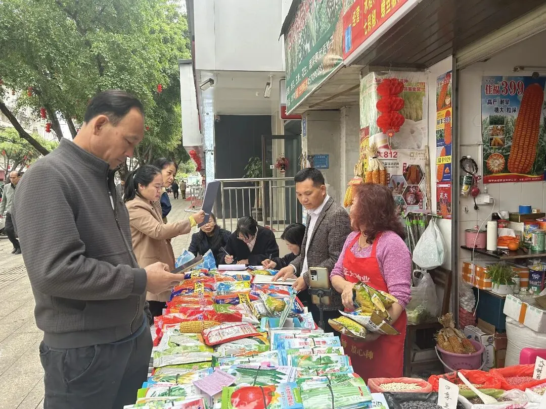 工作人员在江南街道种子经营门店全过程种子质量检查
