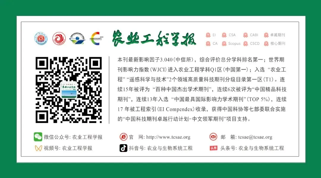 欢迎广大作者、读者投稿至我刊公众号,包括但不限于创新科研成果、科技写作技巧、书籍推介、优秀科技工作者介绍、科研团队招聘/招生、行业资讯以及相关活动等农业工程领域信息。
