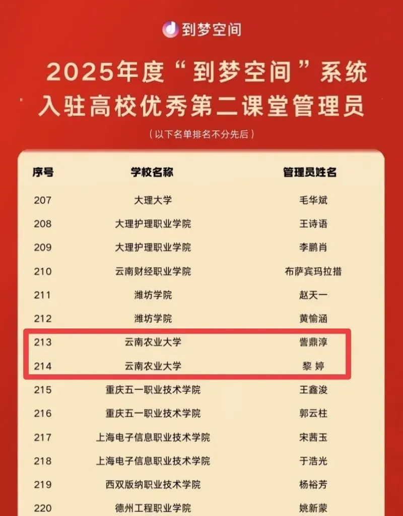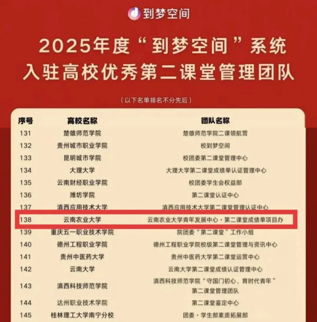 喜传捷报,载誉前行!近日,2025年度“到梦空间”系统入驻高校优秀第二课堂管理团队、优秀第二课堂管理员名单正式公示。学校第二课堂工作再创佳绩,管理团队与个人双双上榜,彰显了学校第二课堂建设的扎实成效与管理队伍的过硬实力。