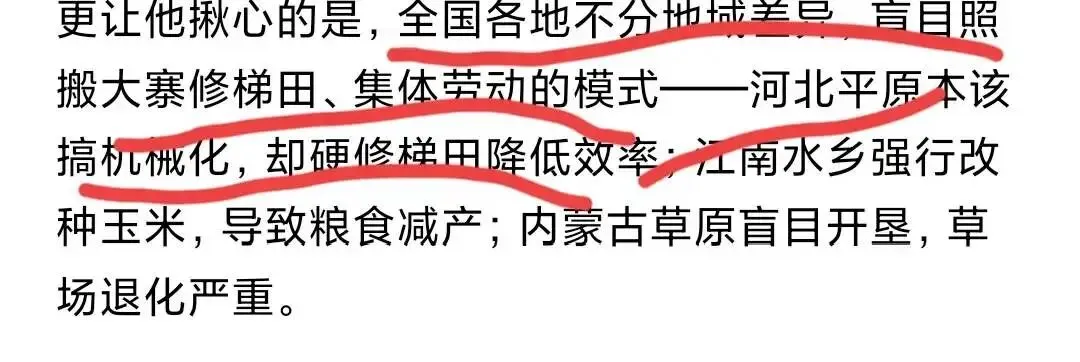 农业学大寨,学什么?但凡知道点儿耕种收割的都知道,是学习大寨人自己动手,根据实际情况,改良生产条件的精神!平原修梯田、江南水乡强令种玉米、内蒙毁草原种粮食,我不知道这是哪里的情况,如果存在这事儿,是那些地方学大寨的方法错了,往轻里说,那是他们犯了教条主义错误;往重里说,他们这是破坏“农业学大寨”!