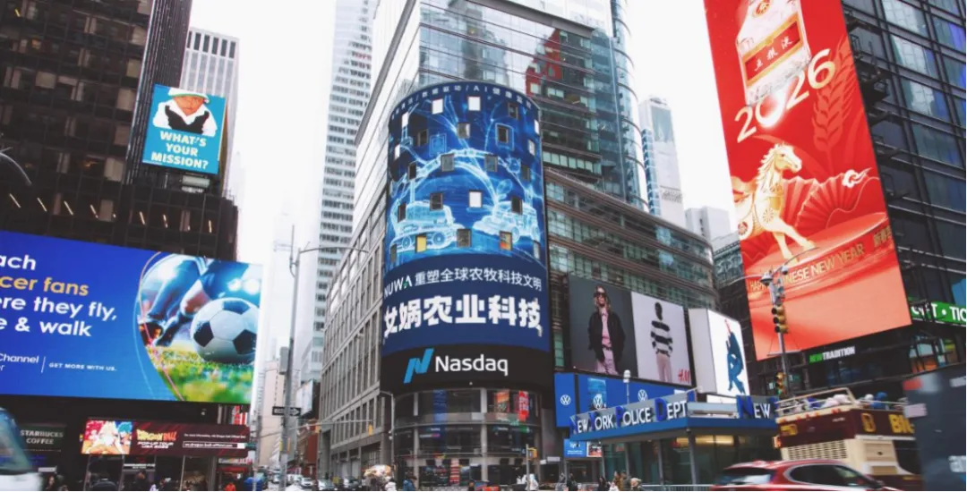 今年春节期间,女娲农业科技首次亮相纽约时代广场纳斯达克塔楼大屏(点击蓝字查看详情),在全球资本市场的中心位置点亮“中国农牧科技”的名字。这一画面不仅象征着中国农业科技企业走向世界,也释放出一个信号:全球农牧产业的智能化变革,正在加速到来。