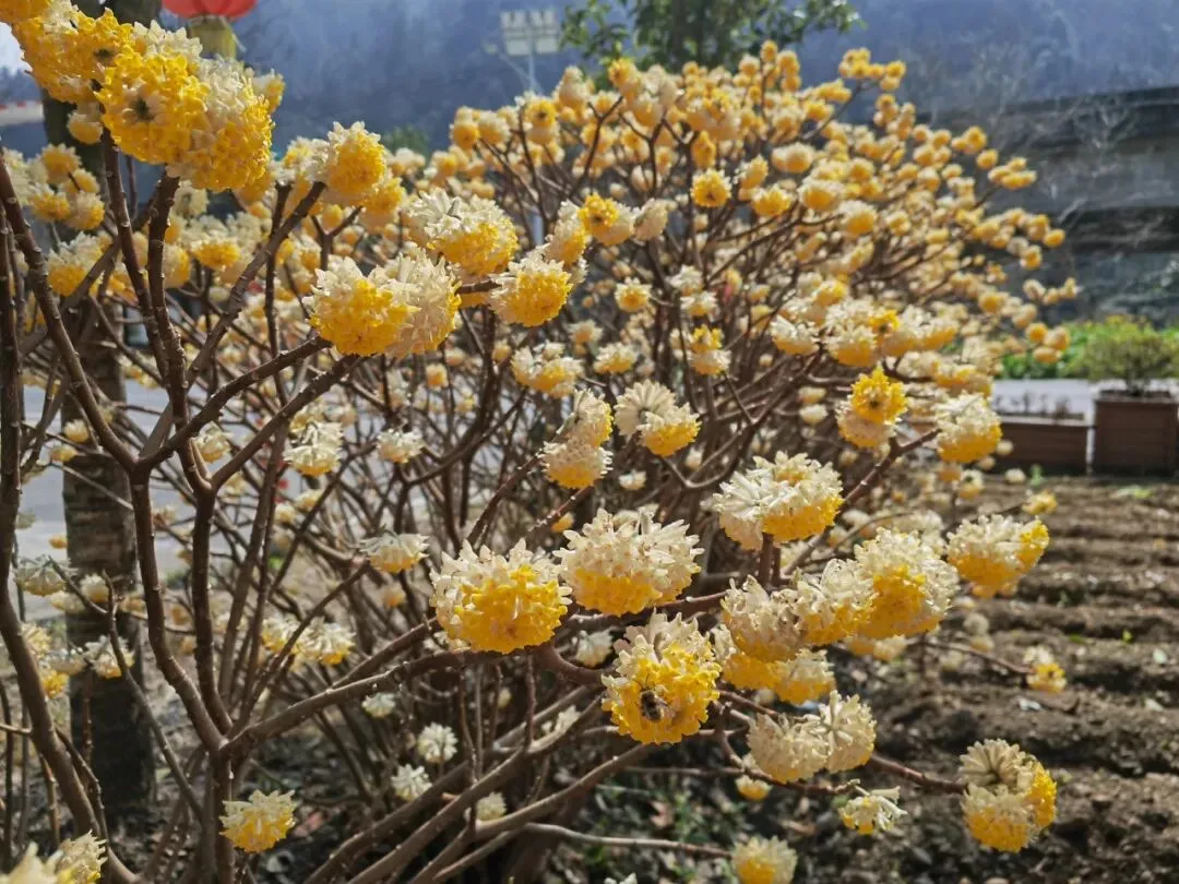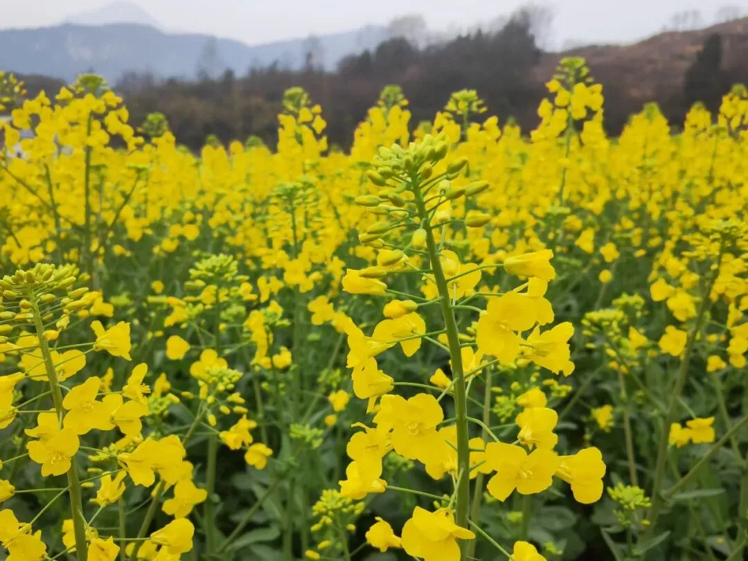 散布于田野之间的油菜花、结香花,像阳光一般温暖。翠绿与明黄的碰撞,蜜蜂自由穿梭其中,如同惊喜般猝不及防。