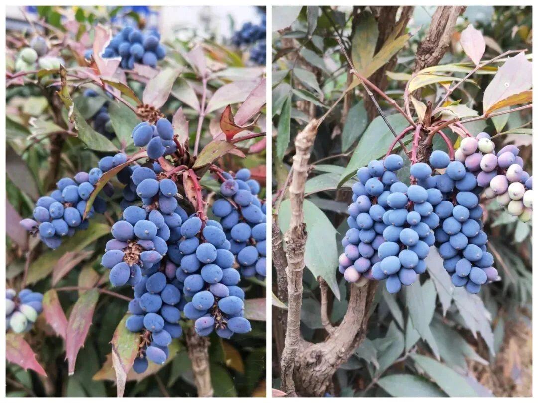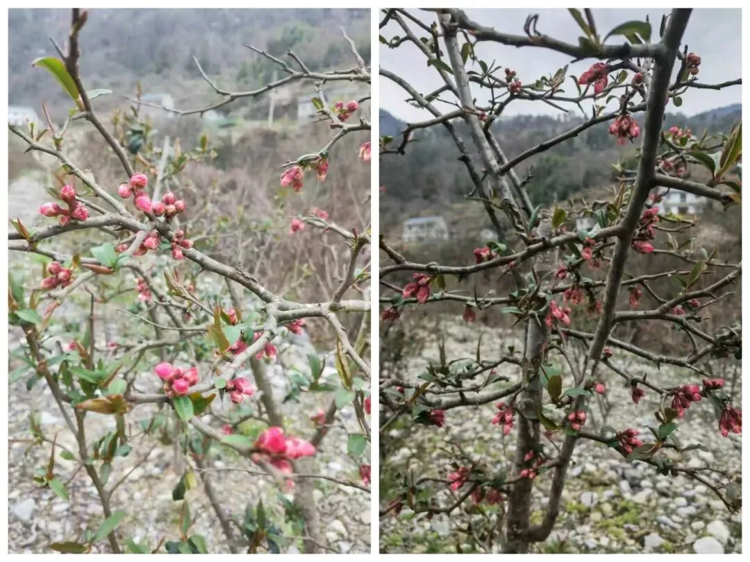 马路边,细叶十大功劳,一串串果实,沉甸甸的;田野里贴梗海棠花骨朵含苞待放,奏响春天的乐章。