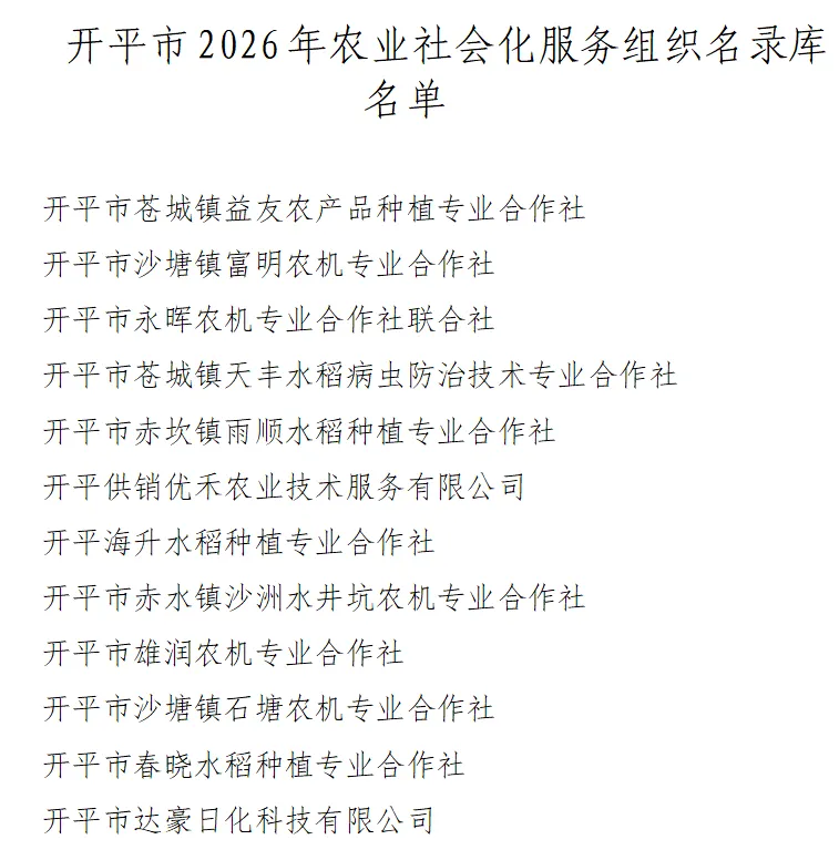 根据《关于印发农业生产托管服务组织名录库建设指引的通知》(粤农农函〔2024〕277号)及《关于开展开平市2026年农业生产托管服务组织名录库更新工作的通知》精神,经主体自愿申报,镇(街)农办审核推荐,经局单位相关股室审定,现将开平市2026年农业社会化服务组织名录库名单予以公示。公示时间:2026年3月4日至3月6日。