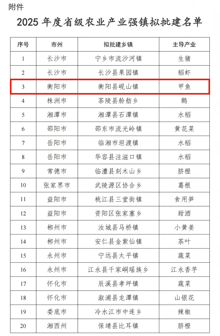 近日,省农业农村厅公示2025年度省级农业产业强镇名单,拟批准长沙市宁乡市流沙河镇等20个乡镇建设省级农业产业强镇。