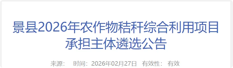 按照《2026年中央农作物秸秆综合利用项目实施储备指南》精神,结合我县实际,拟对景县2026年农作物秸秆综合利用项目承担主体进行公开遴选。现将报名事宜公告如下: