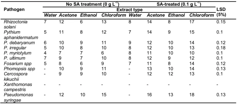 图2 水杨酸及提取类型对大豆种子传播病原菌培养物抑制圈直径(DIZ,毫米)的影响(Sedghet al.,2014)
