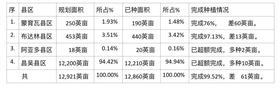 各县区中,以昌吴县区规划种植的面积为最多,该县区规划的种植面积占全专区种植面积九成以上的比例,而且现在该县区也已完成规划的种植面积,还多种10英亩。