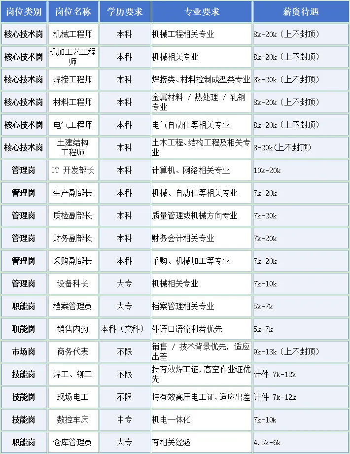本次招聘覆盖技术、管理、职能、市场、技能等多个岗位,具体信息如下: