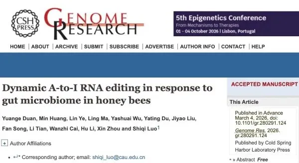 原文链接:Yuange Duan#, Min Huang#, Lin Ye#, Ling Ma, Yashuai Wu, Yating Du, Jiyao Liu, Fan Song, Li Tian, Wanzhi Cai, Hu Li, Xin Zhou, Shiqi Luo*. Dynamic A-to-I RNA editing in response to gut microbiome in honey bees. Genome Research(2026). https://www.genome.org/cgi/doi/10.1101/gr.280291.124