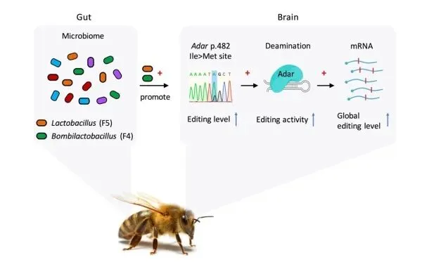 研究团队以西方蜜蜂为模型,构建了无菌组和正常有菌组蜜蜂,通过头部转录组测序系统比较两组个体RNA编辑水平的差异。结果发现,拥有正常肠道菌群的蜜蜂,其脑部整体RNA编辑水平显著高于无菌蜜蜂。但是,负责执行A-to-I RNA编辑的关键酶Adar的表达量在两组间并无显著差异,提示肠道微生物的存在可能影响了该酶的活性,而非其表达量。
