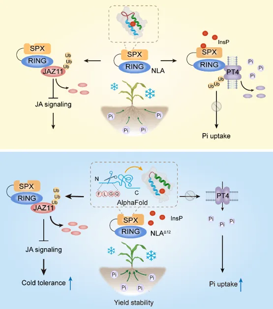 功能分析显示,该变体对InsP的结合能力下降约50倍,几乎丧失对InsPs的感知能力,不再与PT4结合并促进其降解,从而维持根系磷吸收能力;与此同时,NLA与JAZ11的互作不依赖于InsPs水平,NLAΔ12仍可有效降解JAZ11,维持甚至增强JA介导的耐冷信号通路。
