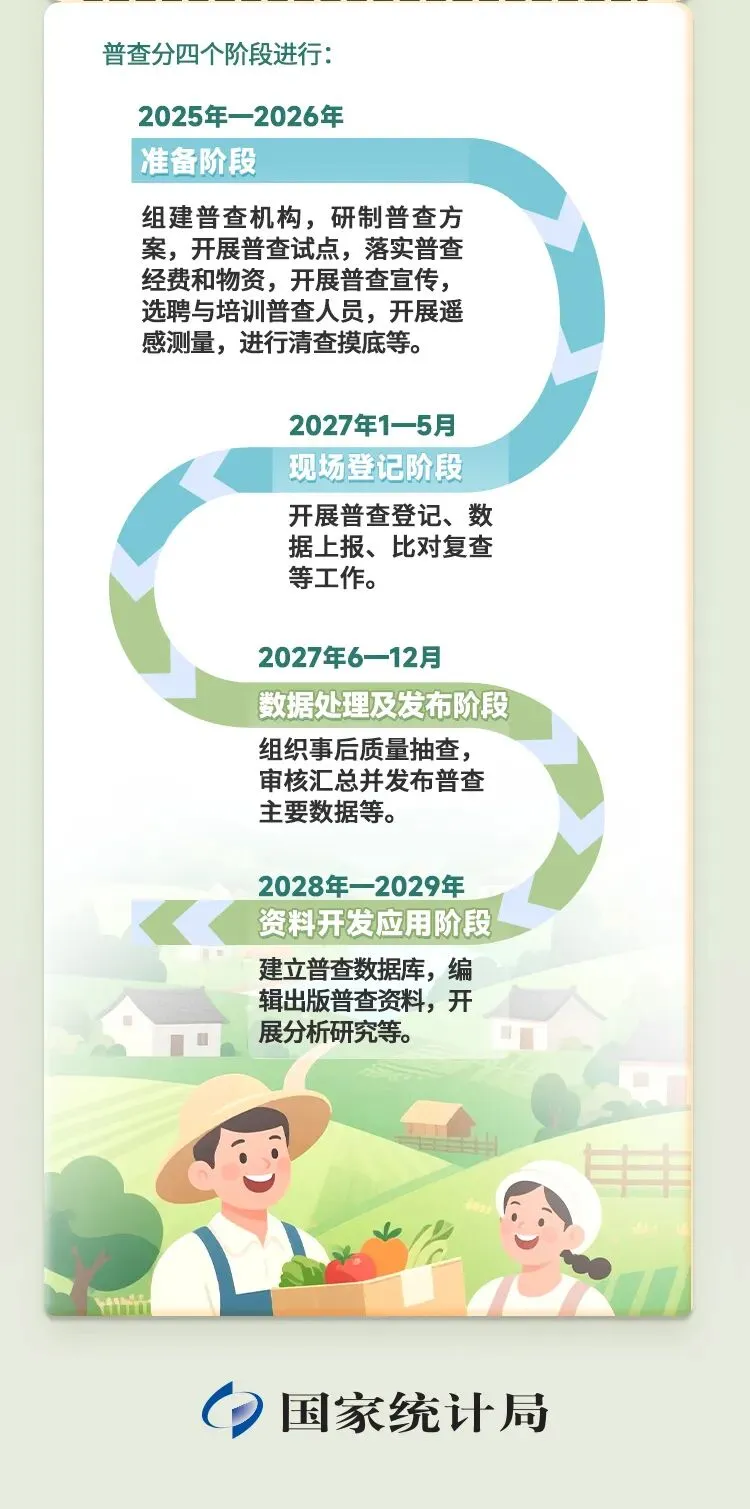 根据《中华人民共和国统计法》和《全国农业普查条例》规定,农业普查每10年进行一次,尾数逢6的年份为普查年度。2026年就是第四次全国农业普查年。