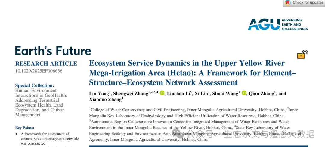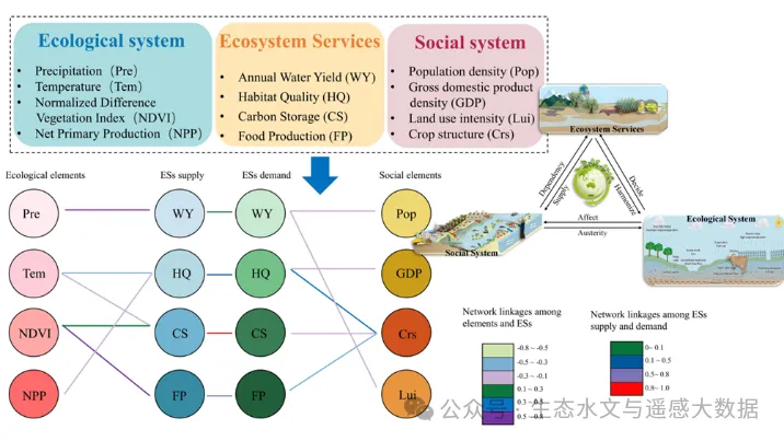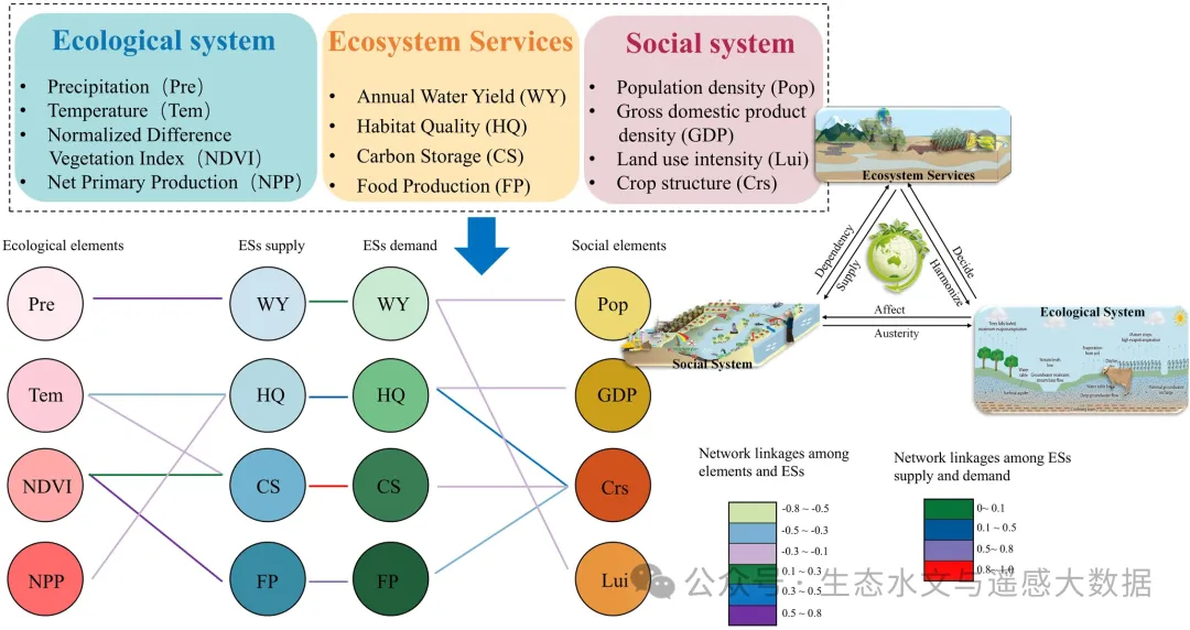 构建要素-结构-生态网络框架。这是文章的核心方法论。研究采用结构方程模型(SEM)作为底层工具,使用R语言中的lavaan包进行运算。在模型中,社会和生态因子被设定为外生变量(Exogenous variables),而生态系统服务被设定为内生变量(Endogenous variables)。通过对数据进行标准化处理,利用最大似然估计法计算路径系数。这些路径系数不仅代表了影响方向,还直观地反映了影响程度,从而将复杂的社会-生态交互作用转化为可视化的网络连接。