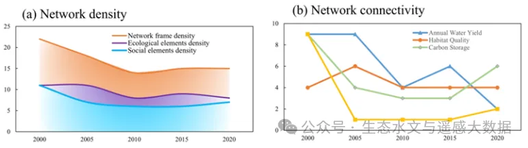 网络参数的动态演变分析。作者重点提取了网络密度和网络连通性两个指标。分析显示,水资源保育服务在早期受NDVI和降水共同调节,而后期降水成为主导因子。社会经济指标(人口、GDP)对需水量的影响逐渐减弱,网络密度从2000年的5下降到2020年的1,这证明了农业灌溉需水量与宏观社会经济增长的脱钩,即农业结构本身而非人口规模才是决定性因素。