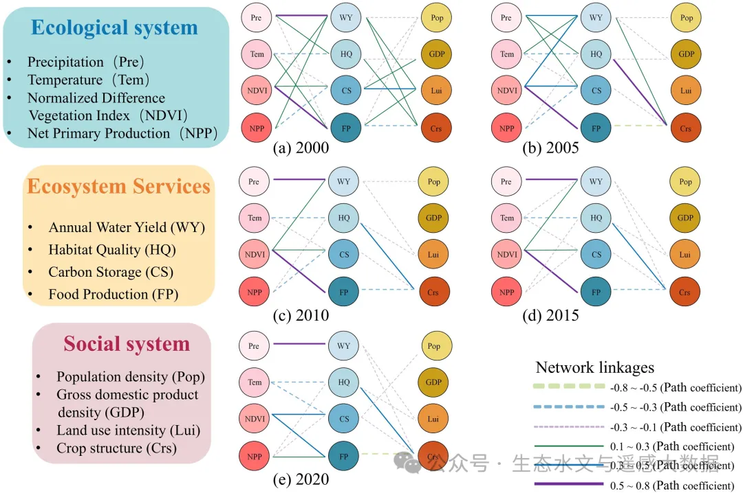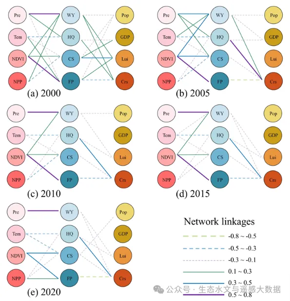 多源数据的集成与处理。研究选取了2000、2005、2010、2015、2020五个时间点。生态要素包括降水、气温、NDVI、NPP;社会要素包括人口密度、GDP、土地利用强度和种植结构。其中,种植结构数据是本研究的特色,研究团队利用Landsat影像,结合深度学习算法(多层感知机模型)和年际迁移技术,提取了30米分辨率的作物类型图,分类精度达89%图4 2000年至2020年的网络动态,网络链接用路径系数表示,其中实线表示正关系,虚线表示负关系,线的粗细是路径系数的大小。(a)为2000年,(b)为 2005年,(c)为 2010年,(d)为2015年,(e)为2020年
