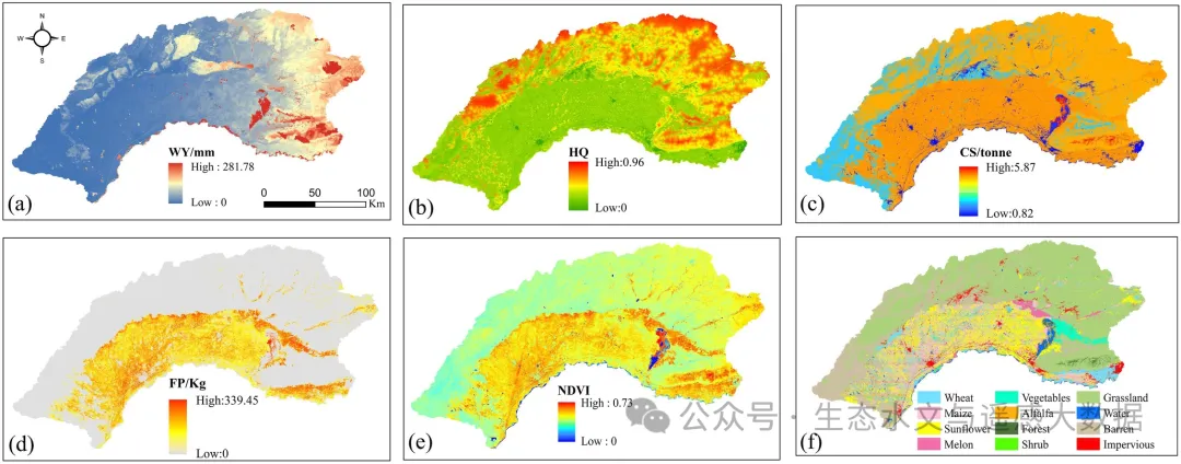 图62020年河套地区生态系统服务及关键要素空间分布。(a)节水供给空间格局(WY);(b)是栖息地质量的空间格局;(c)显示碳汇供给模式(CS);(d)是食物供应的空间格局(FP);(e)为生态要素归一化植被指数(Normalized Difference Vegetation Index)的空间格局;(f)为社会要素种植结构的空间格局