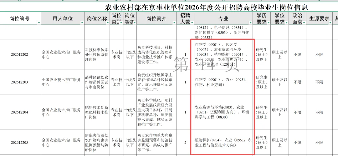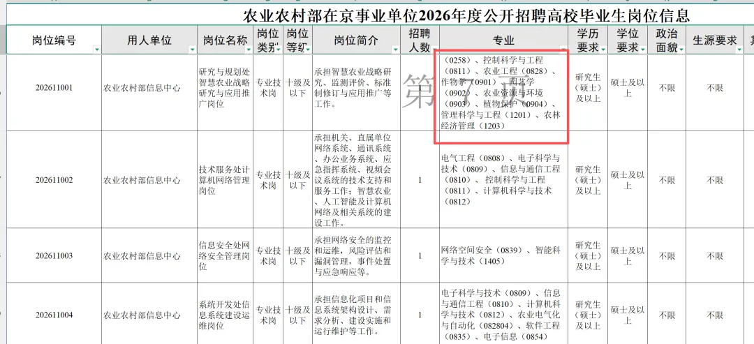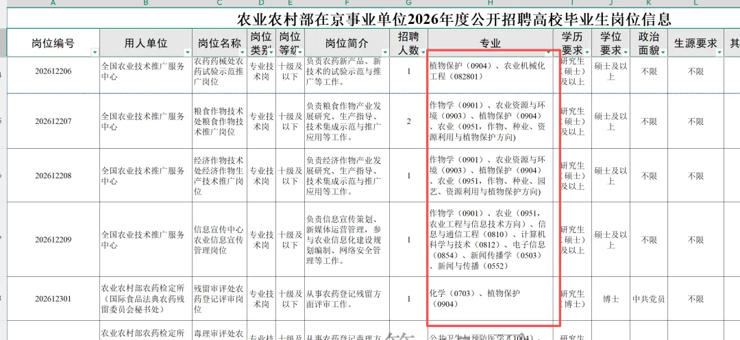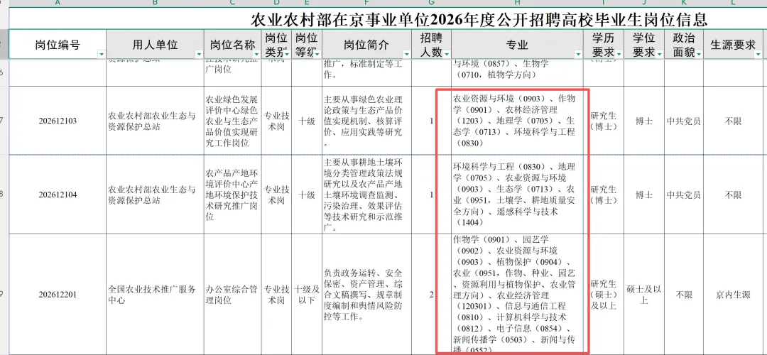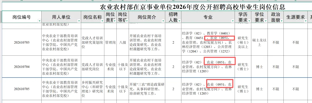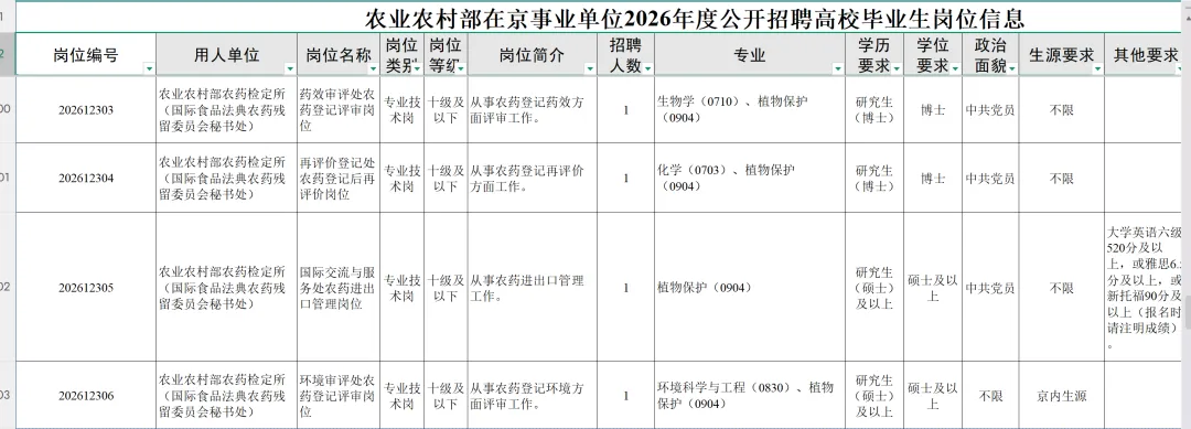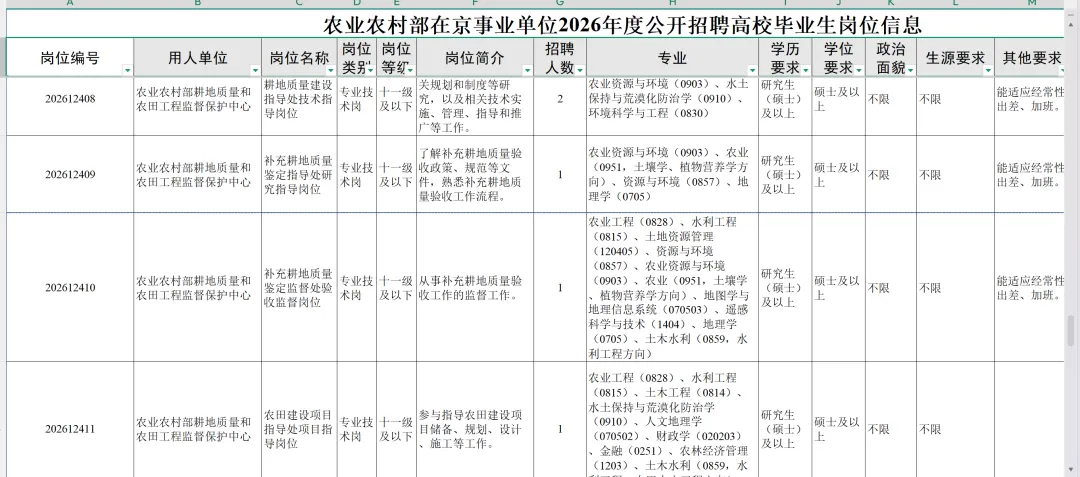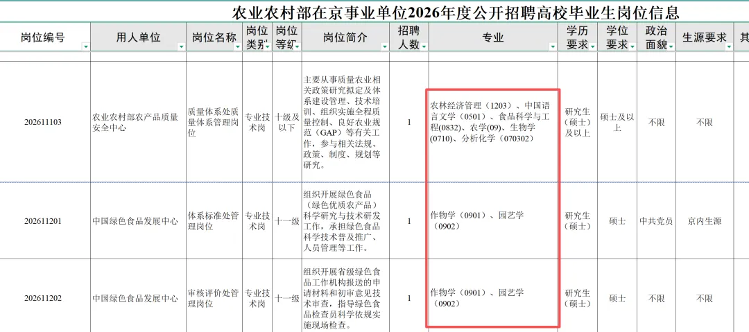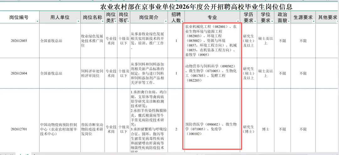 详见《农业农村部在京事业单位2026年度公开招聘高校毕业生岗位信息》(附件1)。