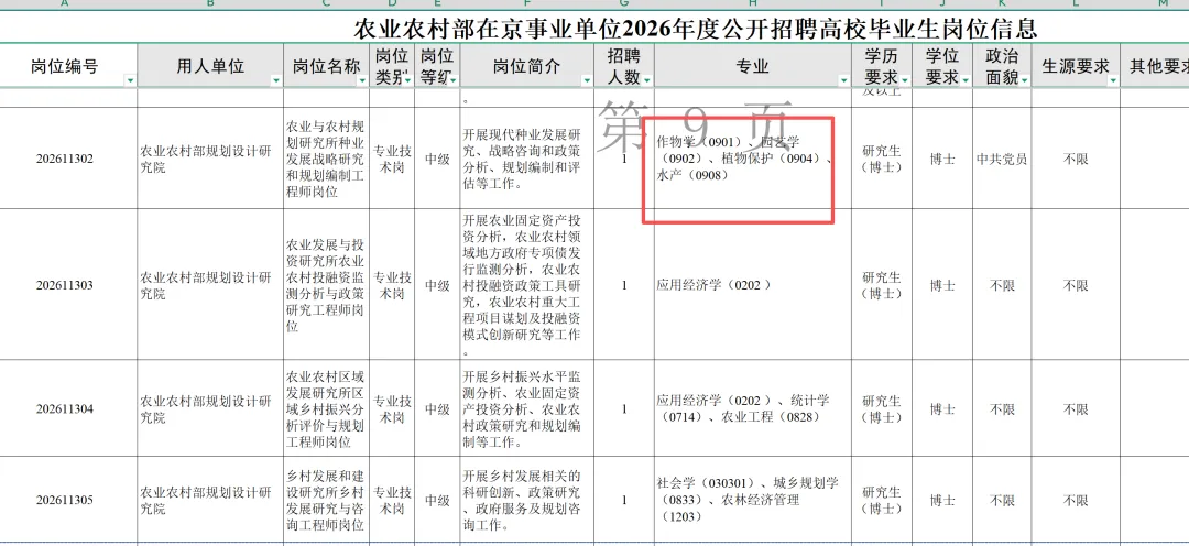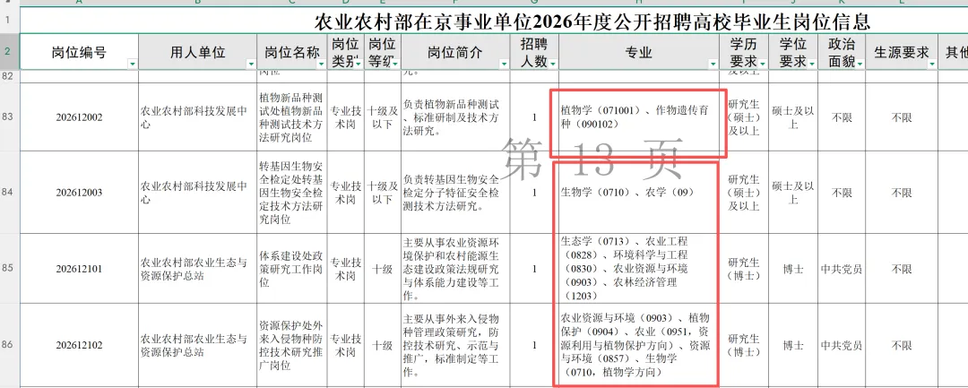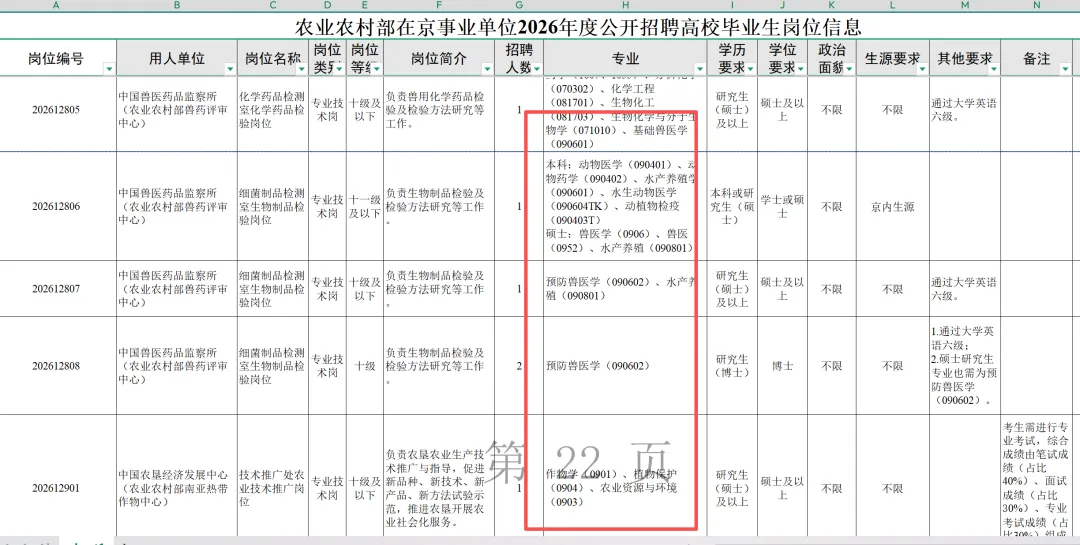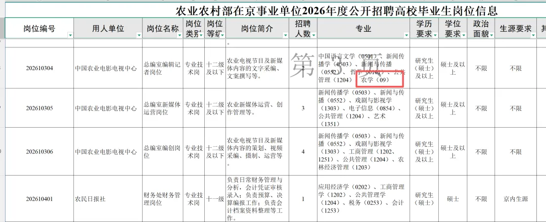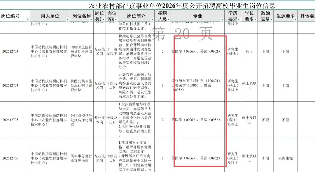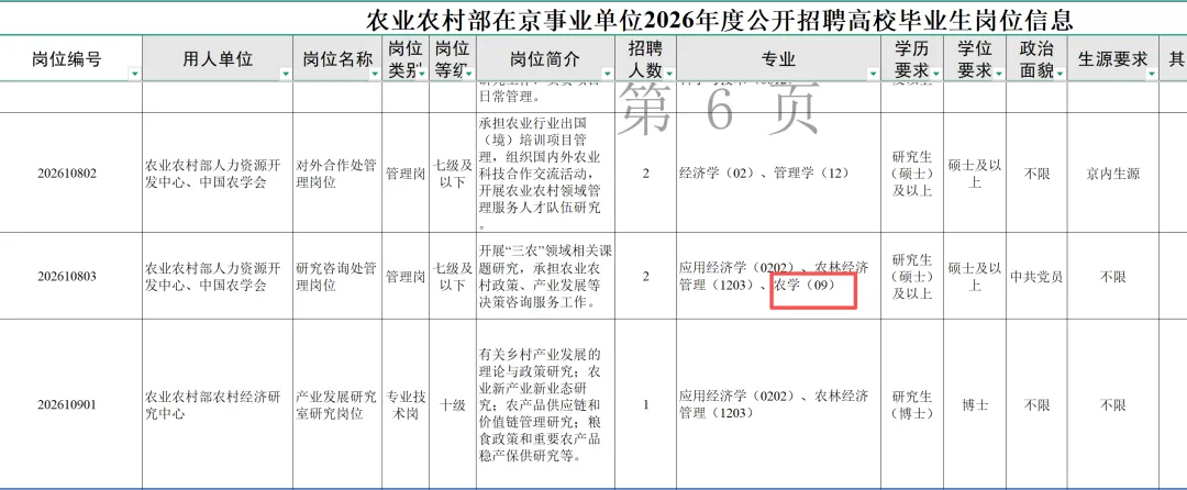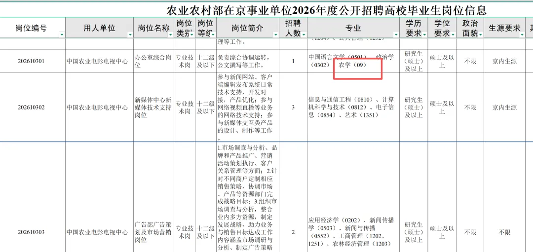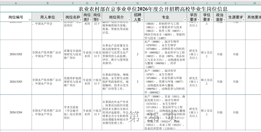 详见《农业农村部在京事业单位2026年度公开招聘高校毕业生岗位信息》(附件1)。