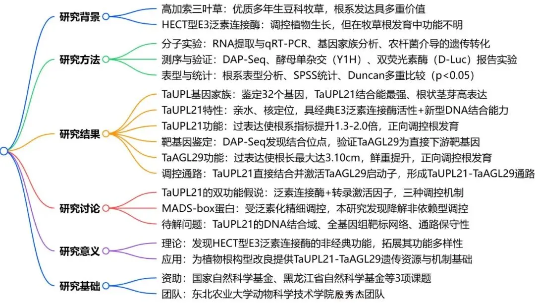 为验证目标基因在根系发育中的作用及其潜在的DNA结合活性,研究实施了毛状根遗传转化与高通量测序分析。在转化处理中,切取生根幼苗的子叶与胚根交界处,将其上部浸入含有pCAMBIA1300-TaAGL29重组质粒的K599农杆菌菌液中,随后转移至MS培养基以诱导不定根的生成。为了在全基因组水平筛选转录调控靶标,采用体外无细胞表达系统诱导合成TaUPL21重组蛋白,并提取高三叶基因组DNA构建测序文库。将重组TaUPL21蛋白与基因组DNA文库共孵育后,分离出与该蛋白特异性结合的DNA片段,最终通过高通量测序技术精准鉴定了其结合位点。