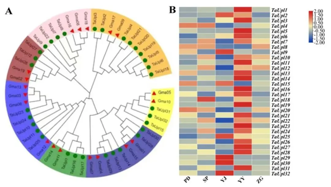 全基因鉴定:从高三叶转录组数据中成功鉴定出32个TaUPL基因。