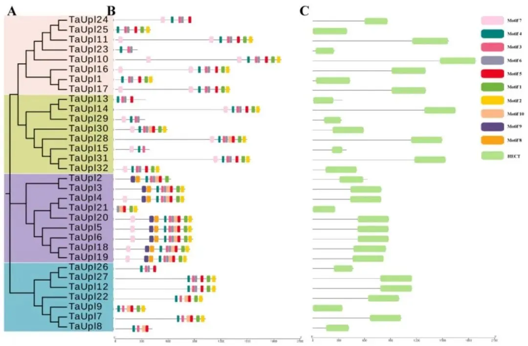 为探究功能结构域和进化关系,单独为TaUPL蛋白构建了最大似然系统发育树,将其聚类为四个不同的进化簇。保守结构域分析证实,所有32个TaUPL蛋白均包含特征性的HECT结构域,且同一进化簇内的蛋白具有相似的结构域组成。利用MEME进行的基序分析进一步识别出多个保守基序,同一系统发育簇内的成员包含完全相同的基序组成。这些分析共同证实了TaUPL基因家族在结构和进化上的高度保守性(Fig.2)。